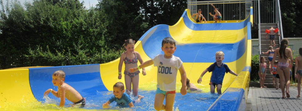 Neben dem Schwimmbad gibt es einen Spraypark mit Wasserdüsen, Springbrunnen und einer echten Familienrutschbahn!